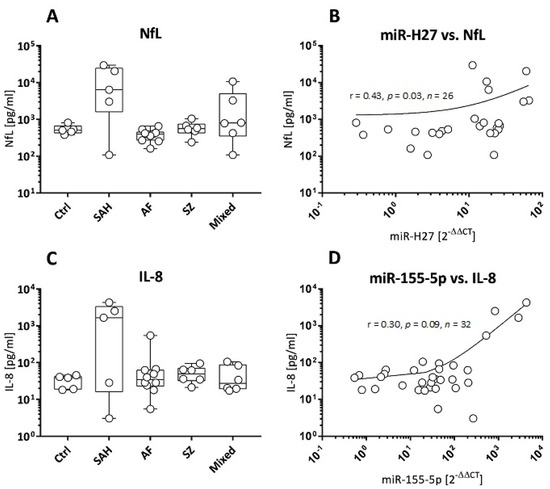 NfL and IL-8 concentrations in correlation to viral and host miRNAs. (A) CSF NfL concentrations (pg/mL), presented as box plots (median + range), for n = 5 controls (Ctrl) and patients with SAH (n = 5), AF (n = 8), SZ (n = 6), and mixed neuroinflammatory diseases (n = 6). (B) Correlation between n = 26 NfL concentrations (A) and corresponding viral miR-H27 fold changes. (C) CSF IL-8 concentrations (pg/mL), presented as box plots (median + range), for n = 5 controls (Ctrl), and patients with SAH (n = 5), AF (n = 10), SZ (n = 6), and mixed neuroinflammatory diseases (n = 6). (D) Correlation between n = 32 IL-8 concentrations (C) and corresponding host-derived miR-155-5p fold changes. Correlations are presented as scatter plots; r: Spearman correlation coefficient, p: significance, n: number of specimens.