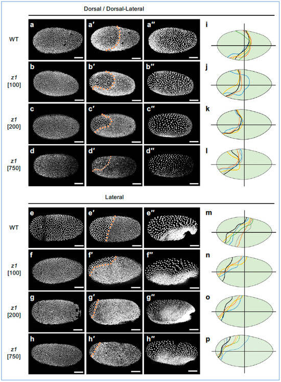 - Rushlow, C.; Levine, M. Role of the zerknüllt gene in dorsal-ventral pattern formation in Drosophila. In Advances in Genetics: Genetic Regulatory Hierarchies in Development; Wright, T.R.F., Ed.; Academic Press: San Diego, CA, USA, 1990; Volume 27. [Google Scholar]