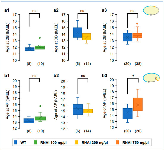 Timing of landmark early events. Timing of blastoderm differentiation ((a1–a3): DB) and amniotic folding ((b1–b3): AF). Only embryos in a strictly lateral view were analyzed for the latter. To mitigate interexperimental differences such as ambient temperature, knockdown embryos were directly compared to within-experiment WT controls. Significance was determined by Mann–Whitney U tests, revealing the onset of a delay during amniotic fold formation in the strongest knockdown treatment (p < 0.05). Sample sizes are indicated parenthetically; box plot features are defined in the Methods. See Supplementary File S1 for raw values and test statistics.