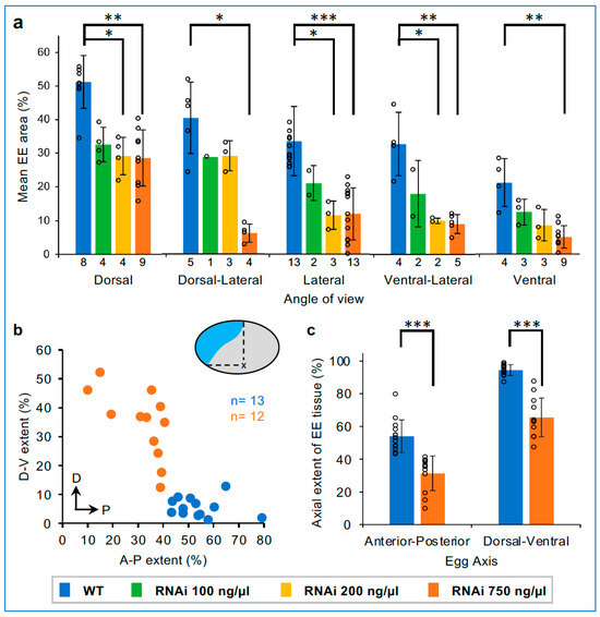 Non-uniform and threshold responses in knockdown EE area reduction. (a) Mean EE tissue area (% relative to egg size) at the differentiated blastoderm stage, for all angles of view for each RNAi condition, with sample sizes indicated at the base of the graph. Error bars represent ± one standard deviation; individual plot points are also shown. (b) An aspect ratio scatter plot for individual embryos in lateral aspect shows the relative reduction in EE tissue area along the A-P and D-V axes (sample sizes indicated in the plot). Compared to the WT serosa, after strong knockdown (dsRNA 750 ng/µL), the presumptive EE tissue does not extend as far ventrally or posteriorly. (c) Mean ± standard deviation summary statistics for the dataset in panel (b): same individual plot points shown. Significance levels are defined in the Methods; unlabeled pairwise comparisons were not significant. See Supplementary File S1 for raw values and test statistics ((a): Kruskal–Wallis with Dunn’s post hoc; (c): Mann–Whitney U).