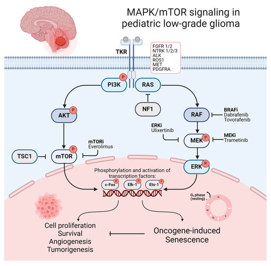 Within the past two decades, in-depth molecular profiling and studies of the genetic landscape of PLGGs identified underlying genetic alterations leading to a frequent activation of the RAS–mitogen-activated protein kinase (RAS/MAPK) pathway as a nearly universal biological feature of these tumors. PLGGs are therefore often referred to as a “single-pathway disease” [68,69,70,71,72,73]. The RAS/MAPK pathway represents one of the best characterized signaling pathways in cell biology. It is involved in regulating essential mechanisms of cell cycle control, cell migration, and angiogenesis, which play a crucial role in tumorigenesis and tumor progression in several malignancies [74,75,76,77]. MAPK/mTOR signaling and its downstream activation of transcriptional factors resulting in tumorigenesis and oncogene-induced senescence (OIS) is illustrated in Figure 2. The first indications of the crucial role of the RAS/MAPK pathway in PLGGs were found in patients with neurofibromatosis type I (NF1). In these patients, germline mutations involving the NF1 tumor suppressor gene cause a loss of function of neurofibromin, a GTPase-activating protein functioning as a negative regulator of RAS [78,79]. This alteration consecutively leads to the development of low-grade gliomas, mainly involving the optic pathway, in up to 20% of cases during childhood [80,81]. Distinct alterations in non-NF1 patients all converging on consecutive RAS/MAPK activation were subsequently discovered. Key mutations driving these tumors include the KIAA1549-BRAF fusion, prevalent in pilocytic astrocytoma (approx. 70%) and rosette-forming glioneural tumors (approx. 30%) in non-NF1 patients, as well as BRAF V600E mutations, commonly found in pleomorphic xanthoastrocytoma (approx. 80%), ganglioglioma (approx. 45%), and pediatric-type diffuse low-grade gliomas (approx. 40%) [69,70,79,82,83,84]. Other less frequent mutations activating the RAS/MAPK pathway include FGFR1/2 alterations, ALK fusions, KRAS mutations, and less frequent mutation or fusions of BRAF with the removal of BRAF’s N-regulatory domain [68,69,79,85,86]. Less common types of PLGGs contain recurrent genetic alterations, including NTRK and the MYB family of transcription factors and fusions involving RAF1 [68,69,87,88]. Protooncogenes of the MYB family are known for their crucial role as transcriptional regulators of proliferation and differentiation, while oncogenic alterations are repeatedly found in PLGGs with diffuse histological features, including angiocentric gliomas [69,79,87,89]. Notably, IDH1/2 mutations, frequently seen in adult gliomas, are rare occurrences in PLGGs and cluster among adolescent patients [90]. Previous observations indicate similar clinical characteristics and progression patterns of IDH1/2-mutant glioma in pediatric and adolescent patients compared to those in adults [90]. Therefore, astrocytoma, IDH-mutant and oligodendroglioma, and IDH-mutant and 1p/19q co-deleted are not covered in this review. An illustration of the frequent and less common genomic alterations of distinct histological types of PLGG is provided in Supplementary Table S1. Beyond contributing to a more profound understanding of tumorigenesis and the driving forces of tumor progression in PLGGs, dissecting the molecular landscape of PLGGs facilitated precise diagnosis and advanced molecular stratification, while also representing a promising avenue for emerging molecular therapies [91].