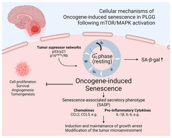 Schematic illustration of OIS fostering the SASP in PLGGs. Created with BioRender.com (accessed on 8 July 2024).