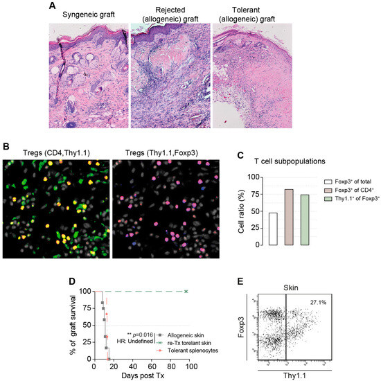 The rejected allogeneic skin grafts showed massive lymphohistiocytes with severe necrosis in the skin sections (Figure 2A). There was pronounced acanthotic broadening of the epidermis and a dense orthohyperkeratosis. Hypergranulosis was observed in the epidermis. Hair follicles and sebaceous glands were absent in the fibrotic areas. Hair follicle fragments were surrounded by histiocytic, multinucleated foreign body giant cells. The upper and middle coria contained pigment-loaded macrophages, mostly melanophages. Surprisingly, explanted syngeneic skin grafts and tolerant allogeneic skin transplants from mice that received allogeneic Tregs showed mild lymphatic infiltration, acanthotic epidermal broadening, and orthohyperkeratosis (Figure 2A). Immunofluorescence analysis of tolerated skin revealed a high intradermal Treg/Teff ratio of almost 1:1 and a high Foxp3+ Treg percentage (80%) within the CD4+ T-cell subpopulation, demonstrating the tolerogenic status of the milieu (Figure 2B,C). Furthermore, we identified adoptively transferred allospecific cTregs by thy1.1 expression. Seventy-five percent of all locally accumulated Tregs were thy1.1+ and therefore allospecific cTreg in histological sections.