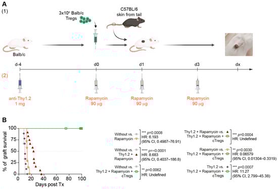 The thymocyte antigen Thy-2 is a classical T-cell marker. It is classically used for lymphocyte depletion because murine anti-thymocyte globulin (ATG) is no longer available [33]. Therefore, its action in murine models resembles the effect of the anti-CD52 antibody alemtuzumab and various ATGs used in clinical transplantation. Subsequently, we combined antiproliferative treatment with the mTOR inhibitor, rapamycin, and induction therapy. We intentionally inhibited mTOR to preferentially stop the proliferation of conventional T cells but only weakly affected that of Tregs [34,35]. Therefore, mTOR inhibition is routinely used by GMP facilities to prepare Treg populations for clinical trials (Figure 3A).