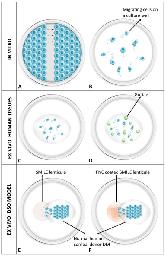 Illustration of different methods used to study migration of human corneal endothelial cells. (A) In vitro scratch assay and (B) random migration assay using immortalized normal and FECD cells. (C) Ex vivo random migration of normal human and (D) FECD cells on their respective native Descemet membrane. (E) A schematic of the ex vivo DSO model showing the DM attached on the SMILE lenticule without the FNC coat and (F) with the FNC coating. DM: Descemet’s membrane; FECD: Fuchs endothelial corneal dystrophy; FNC: fibronectin collagen mix; SMILE: small incision lenticule extraction.