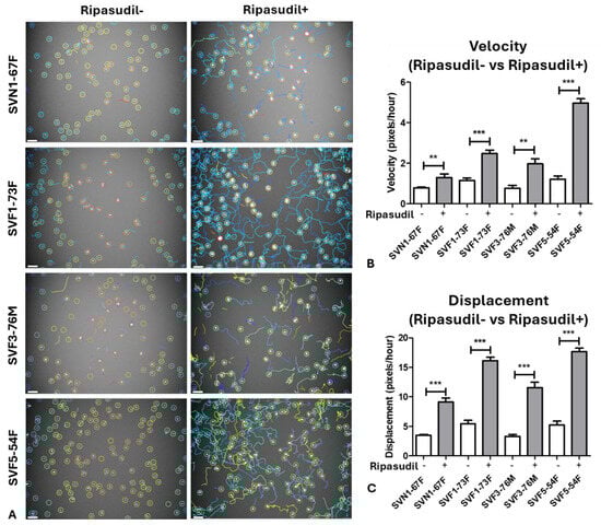 However, supplementation with ripasudil (1 µM) significantly enhanced the velocity (pixels/hour) of SVN1-67F (1.3 ± 7.6; p < 0.01), SVF1-73F (2.5 ± 2.5; p < 0.001), SVF3-76M (2.1 ± 9.9; p < 0.01), and SVF5-54F (4.9 ± 2.7; p < 0.001) cells, indicating that the drug accelerates migration in all cell lines (Figure 2B). Interestingly, there was a greater increase in the velocity in response to ripasudil in SVF1-73F (2.2-fold; p < 0.05), SVF3-76M (2.6-fold; p < 0.01), and SVF5-54F (4.1-fold; p < 0.001) compared to SVN1-67F (1.6-fold), indicating that FECD cells were more responsive to ripasudil (Supplementary Figure S2C). Concurrently, ripasudil increased the displacement (pixels/hour) of SVN1-67F (9.1 ± 2.2), SVF1-73F (16.1 ± 9.4), SVF3-76M (11.6 ± 2.4), and SVF5-54F (17.7 ± 3.3) compared to the baseline (p < 0.001) (Figure 2C). Similarly to velocity, SVF3-76M (3.5-fold; p < 0.01) and SVF5-54F (3.4-fold; p < 0.01) showed a significantly greater increase in displacement after the ripasudil treatment compared to SVN1-67F cells (2.6-fold) (Supplementary Figure S2D).