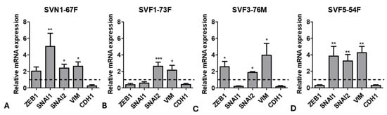 Endothelial-to-mesenchymal transition (EMT) analysis after ripasudil treatment. Upregulation of EMT markers ZEB1, SNAI1/2, and VIM, and the downregulation of CDH1 in (A) normal (SVN1-67F) and FECD (B) SVF1-73F, (C) SVF3-76M, and (D) SVF5-54F cells after treatment with ripasudil, normalized to their respective untreated controls. * p < 0.05; ** p < 0.01; *** p < 0.001. The data are expressed as mean ± SEM.