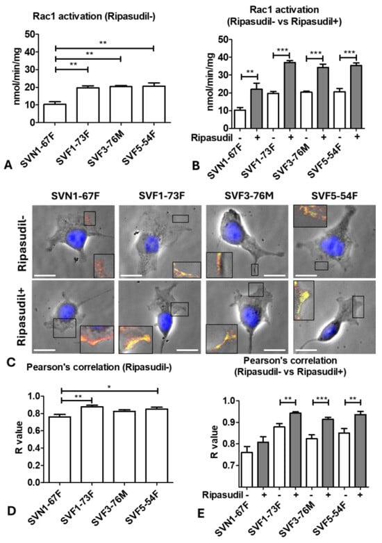 Since ripasudil is an inhibitor of RhoA, which is a GTPase with a known function in actin cytoskeleton rearrangements [], we further investigated the underlying mechanism of how RhoA inhibition enhanced cellular migration during the wound-healing process. Since cellular locomotion is affected by the antagonistic interplay between RhoA and Rac1, which is another Rho-family GTPase involved in actin polymerization, we investigated Rac1 activity by the luminescence assay. Using this technique, we detected that, at baseline, Rac1 activity in the FECD cells SVF1-73F (20 ± 2; p < 0.01), SVF3-76M (20 ± 1; p < 0.01), and SVF5-54F (21 ± 3; p < 0.01) was higher compared to the normal cells (SVN1-67F; 10 ± 3) (Figure 5A), indicating that the intrinsic activation of Rac1 may be associated with the increased migratory capacity of FECD cells at baseline (Supplementary Figure S2). Moreover, ripasudil further caused a greater upregulation of Rac1 in SVF1-73F (37 ± 2; p < 0.01), SVF3-76M (34 ± 3; p < 0.05), and SVF5-54F (35 ± 3; p < 0.05) compared to the normal cells (SVN1-67F; 22 ± 6) (Supplementary Figure S4A), and led to the significant activation of Rac1 compared to the untreated controls in all cell lines: SVN1-67F (2.1-fold; p < 0.01), SVF1-73F (1.9-fold; p < 0.001), SVF3-76M (1.7-fold; p < 0.001), and SVF5-54F (1.7-fold; p < 0.001) (Figure 5B).