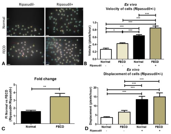 Ex vivo normal and FECD cell migration on their respective Descemet membranes after ripasudil treatment. (A) Trackmate analysis of normal and FECD cells using ImageJ showing the migration of cells with and without ripasudil on their respective DMs [the black space represents Descemet’s membrane void of endothelial cells, and the circles mark the border of the nucleus stained with Hoechst]. (B) The velocity of normal and FECD cells at baseline and after the treatment with ripasudil ex vivo. (C) The fold increase in the velocity of normal and FECD cells after the treatment with ripasudil. (D) The displacement of normal and FECD cells at baseline and after the treatment with ripasudil ex vivo. * p < 0.05; ** p < 0.01; *** p < 0.001. The data are expressed as mean ± SEM. Scale: 50 µm.