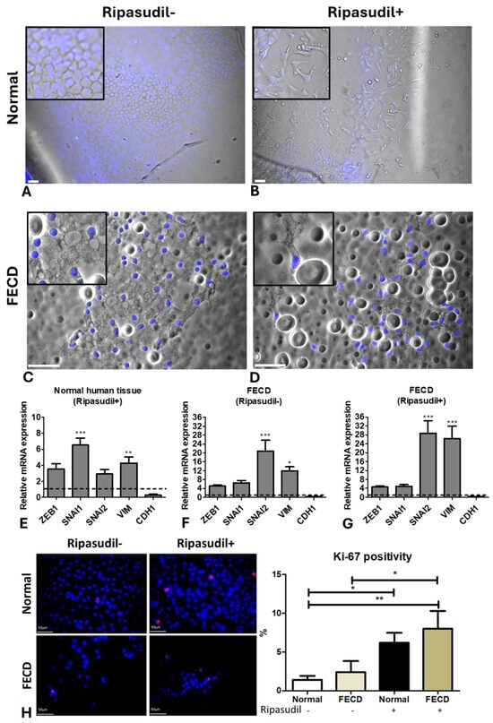 Ex vivo normal and FECD tissue. Normal corneal tissue stained with Hoechst showing (A) a hexagonal morphology without ripasudil and (B) an EMT-like morphology with ripasudil at the edge of the migrating cells. FECD tissue stained with Hoechst showing (C) rosette-like structures without ripasudil and (D) an EMT-like morphology with ripasudil. RT-PCR analysis of EMT genes in (E) normal tissue treated with ripasudil, and FECD tissue (F) untreated and (G) treated with ripasudil, normalized to untreated normal tissue. (H) The expression and analysis of the Ki-67-positive cell percentage on normal and FECD tissues and those treated with ripasudil. Blue: nucleus (Hoechst+); Red: proliferating cells (Ki67+). * p < 0.05; ** p < 0.01; *** p < 0.001. Figure insert—high magnification. The data are expressed as mean ± SEM. Scale: 50 µm.