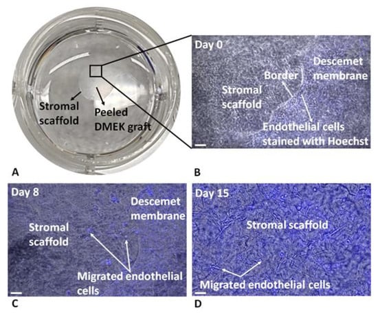 Ex vivo Descemet’s Stripping Only model. (A) Ex vivo DSO model as observed macroscopically in a 12-well cell culture plate. (B) Microscopic image of the DM attached on the stroma (SMILE lenticule) with stained endothelial cells at day 0. (C) Image of migrating endothelial cells from the DM to the stroma at day 8 and (D) migrated cells on the stroma at day 15. Scale: 50 µm.