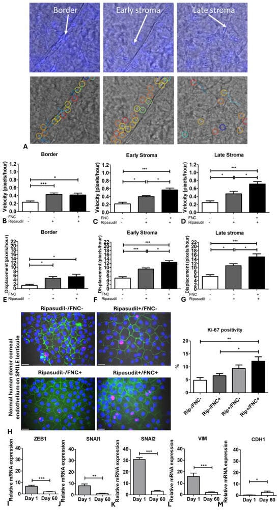Velocity and displacement of normal corneal endothelial cells from the Descemet membrane to the stroma (SMILE lenticule) using ex vivo Descemet’s Stripping Only model. (A) Trackmate analysis of three regions of interest to analyze the velocity and displacement of cells on the stroma with and without FNC/ripasudil. Velocity of cells at (B) the border, (C) early stroma, and (D) late stroma, and displacement of cells at (E) the border, (F) early, and (G) late stroma with FNC (+/−) and ripasudil (+/−). (H) Expression of ZO-1 marker and Ki-67 positivity on day 60. EMT genes (I) ZEB1, (J) SNAI1, (K) SNAI2, (L) VIM, and (M) CDH1 expressed by normal corneal endothelial cells migrated on the stroma after day 1 and day 60 of storage. Blue: nucleus (Hoechst+); Red: proliferating cells (Ki67+); Green: intercellular tight junctions (zonula occludens 1 (ZO-1+)). * p < 0.05; ** p < 0.01; *** p < 0.001. The data are expressed as mean ± SEM. Scale: 20µm.