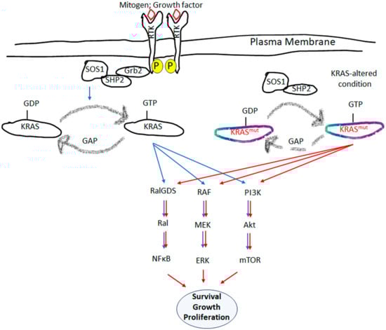 Activation of KRAS and downstream-signaling pathway. In normal physiological conditions, binding of growth factor to the plasma membrane-associated receptor tyrosine kinase (RTK) induces dimerization and phosphorylation of RTKs. Phosphorylated-RTKs eventually recruit the docking protein, growth factor receptor bound protein-2 (GRB2), and binding with the son of sevenless 1 (SOS1), which itself is a GEF. This activated SOS1, substituting GDP with GTP to KRAS, leading to subsequent conformational changes and activation of downstream factors. The transition from KRAS-GTP to KRAS-GDP, the inactive state, requires GTPase activating protein (GAP). In the activated form of KRAS, it targets downstream effector pathways, namely, (i) RAF/MEK/ERK, (ii) PI3K/Akt/mTOR, and (iii) Ral-GEF/Ral pathway. Mutated KRAS does not need the event of upstream activation. GEF-mediated activation state of KRASmut protein further activates the above-mentioned downstream effector pathways. Blue arrows denote normal physiological conditions, and red arrows indicate the KRAS-mutated state in cancer cells.