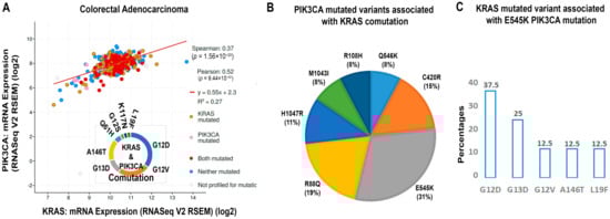 Mutant variants of KRAS with the coexisting mutations of PIK3CA in colorectal adenocarcinoma (CRAD). In the dot plot (A), mutated KRAS is presented as orange, mutated PIK3CA is presented as pink, the mutations of both KRAS and PIK3CA are presented as red, no mutation is presented as blue, and those not profiled for modification are presented as white. The KRAS-mutated variants are represented as a Doughnut diagram associated with the PIK3CA co-mutation. The high prevalence of mutations of G12D and G12V KRAS is concomitantly associated with PIK3CA mutation in CRAD (A). A positive correlation exists at the mRNA level between the PIK3CA and KRAS (Spearman’s coefficient: 0.37; Pearson’s coefficient: 0.52) (A). The pie diagram represents the first five prevalent PIK3CA mutations coexisting with mutated KRAS variants (B). Among the PIK3CA mutated variants, E545K represents the highest occurrence of co-mutation associated with mutated KRAS, followed by R88Q, C420R, and H1047R (B). Column diagram represents the percentages of KRAS-mutated variants associated with the E545K co-mutation of PIK3CA (C), where G12D remains the prevalent mutation, followed by G13D and others (G12V, A146T, and L19F) (C). Data collected from cBioPortal.