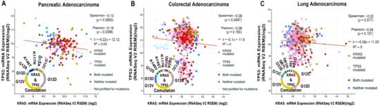 Mutant variants of KRAS with the coexisting mutations of TP53 in pancreatic adenocarcinoma (PAAD) (A), colorectal adenocarcinoma (CRAD (B), and lung adenocarcinoma (C). In the dot plots (A–C), mutated KRAS is presented as orange, mutated TP53 is presented as pink, mutation of both KRAS and TP53 are presented as red, no mutation is presented as blue, and not profiled for modification is presented as white. The KRAS-mutated variants are represented as a Doughnut diagram associated with TP53 co-mutation (A–C). The high prevalence of mutations of G12D and G12V KRAS is concomitantly associated with TP53 mutations in PAAD (A) and CRAD (B). In contrast, G12V and G12C KRAS mutations are mainly associated with TP53 co-mutation in LUAD (C). Though co-mutation exists, no significant correlation was observed between KRAS and TP53 at the level of mRNA expression (A–C). Data collected from cBioPortal.