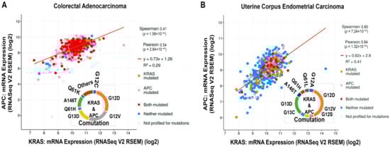 Mutant variants of KRAS with the coexisting mutations of APC in colorectal adenocarcinoma (CRAD (A), and Uterine Corpus Endometrial Carcinoma (UCEC) (B). In the dot plots (A,B), mutated KRAS is presented as orange, mutated APC is presented as pink, mutation of both KRAS and APC are presented as red, no mutation is presented as blue, and not profiled for modification is presented as white (A,B). The KRAS-mutated variants associated with APC co-mutation are represented as a Doughnut diagram (A,B). The prevalent KRAS mutations are G12D, G12V, and G13D, which are associated with APC co-mutation in CRAD (A), whereas G12D and G13D are prevalent KRAS mutations associated with APC co-mutation in UCEC (B). Dot plots show the positive correlation of KRAS and APC in CRAD (Spearman’s coefficient: 0.41; Pearson’s coefficient: 0.54) (A), and UCEC (Spearman’s coefficient: 0.60, Pearson’s coefficient: 0.64) (B). Data collected from cBioPortal.