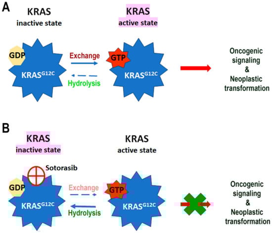 Mechanism of inhibition of mutated-KRAS using Sotorasib inhibitor. (A) A mutated form of KRASG12C-GDP inactive state activated by guanine nucleotide exchange factor (GEF) to KRASG12C-GTP active state. KRASG12C-GTP is the cell’s major form due to disrupted GTPase-activating protein (GAP), which converts to KRASG12C-GDP state. The active form of KRASG12C-GTP regulates oncogenic signaling leading to neoplastic transformation. (B) Sotorasib binds explicitly to the KRASG12C-GDP inactive state of the protein and restricts the conversion of the KRASG12C-GTP state leading to the trapping of KRASG12C-GDP. With the restriction of the KRAS-active state, there is inhibition of oncogenic signaling and neoplastic transformation.