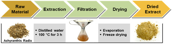 Achyranthis radix was purchased from Kwangmyungdang Medicinal Herbs, Ulsan, Republic of Korea. The voucher specimen (KIOM-USL) has been deposited in the Herbarium of the Korea Institute of Oriental Medicine (KIOM, Daejeon, Republic of Korea). Achyranthis radix (1 kg) was extracted with distilled water (10 L) at 100 °C for 3 h using a heat-reflux extractor. The extract solution was filtered and evaporated under reduced pressure using a rotary evaporator (N-1200A, Eyela, Tokyo, Japan) at 50 °C. The concentrated extract solution was then freeze-dried using a freeze-dryer (FDU-2100, Eyela, Tokyo, Japan) at −80 °C for three days to obtain a dried extract powder (298.5 g, yield 29.85%).