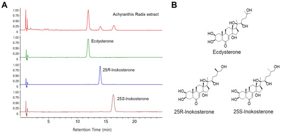Extraction process of Achyranthis radix and HPLC analysis of ARE. (A) HPLC chromatograms of ARE and three reference standards (ecdysterone, 25R-inokosterone, and 25S-inokosterone). Chromatographic conditions are described in the text. Detection was at 250 nm. (B) Chemical structures of three standard compounds.