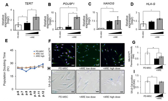 To investigate the cell proliferative effect of ARE on PD-MSC, the cells were treated for 24 h with ARE extracted via hot water at concentrations of 13.5 (ARE low) or 135 (ARE high) ng/mL. We tested a range of concentrations to ensure the selection of the most effective and non-toxic dose (Figures S1 and S2). The ARE priming increased the expression of stemness markers, TERT, POU5F1, NANOG, and HLA-G in PD-MSC in a dose-dependent manner (Figure 3A–D). Stemness denotes the capacity of these cells to differentiate into diverse cell types, and manipulating this characteristic can profoundly impact their behavior. MSCs with enhanced stemness possess an increased ability to self-renew.