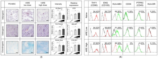 Placentas obtained at term (37 gestational weeks) in women who did not experience any obstetric, perinatal, or surgical problems were used. The IRB at CHA General Hospital, Seoul, Republic of Korea, approved the sample collection and usage for the study (IRB 07-18). Written informed consent was obtained from all women who participated. Placenta-derived mesenchymal stem cells (PD-MSCs) were isolated using a previously described method [39]. Alpha-modified minimal essential medium (α-MEM, HyClone, Logan, UT, USA) was used to maintain PD-MSCs. This medium was supplemented with 10% fetal bovine serum (FBS, Gibco, Carlsbad, CA, USA), 1% penicillin/streptomycin (P/S, Gibco), and 25 ng/mL human fibroblast growth factor-4 (hFGF-4, PeproTech, Rocky Hill, NJ, USA). The cells were maintained at 37 °C in a humid atmosphere containing 5% CO2 for 24 h. PD-MSCs were subjected to treatment with concentration of 13.5 and 135 ng/mL of ARE for a duration of 24 h.