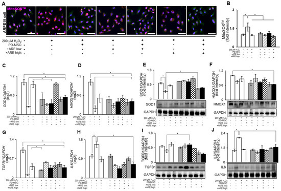 RPE (retinal pigment epithelium) cells are highly metabolically active and are constantly exposed to oxidative stress due to factors like light exposure and high oxygen tension. As a result, they rely on a robust antioxidant defense system to protect themselves from oxidative damage. Antioxidants play a crucial role in maintaining the health and function of RPE cells by neutralizing reactive oxygen species (ROS) and reducing oxidative stress [7,52]. According to the data presented in Figure 4A,B, it can be observed that the application of H2O2 treatment resulted in a substantial increase in mitochondrial ROS levels in the ARPE19, a human RPE cell line. This increase was measured using the MitoSOXTM indicator and quantified using image J software. Conversely, the administration of high-dose -ARE-primed PD-MSC treatment led to a significant reduction in MitoSOXTM signals, indicating a decrease in oxidative stress. Furthermore, the H2O2 treatment resulted in a significant decrease in the expression of antioxidant factors such as SOD1 and HMOX1 (HO-1). Conversely, ARE-primed PD-MSC treatment led to dramatically elevating antioxidant levels in the high-dose ARE-primed PD-MSC group (Figure 4C–F). Also, we confirmed the presence of inflammatory markers in ARPE19 cells. The anti-inflammatory marker TGFB1 decreased in the H2O2 group but increased in the -ARE-primed PD-MSC group. Interestingly, TGFB1 levels were high in the low-dose -ARE-primed PD-MSC treatment group. The expression of the pro-inflammatory marker IL-6 was found to decrease in the PD-MSC treatment group (Figure 4G–J). These data provide evidence that the treatment of ARE resulted in a reduction of oxidative and inflammatory stress in retina cells.