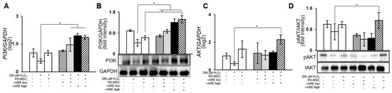 ARE-primed PD-MSC increased PI3K/AKT signaling. The mRNA levels of (A) PI3K, (C) AKT were analyzed by qRT-PCR. The protein levels of (B) PI3K, (D) AKT were analyzed by Western blot. We replicate each experiment triple and total sample amount is 5. Data represent the mean ± SEM. Statistical significance was determined by using one-way ANOVA and Tukey’s post hoc test for the comparison of groups, * p < 0.05.