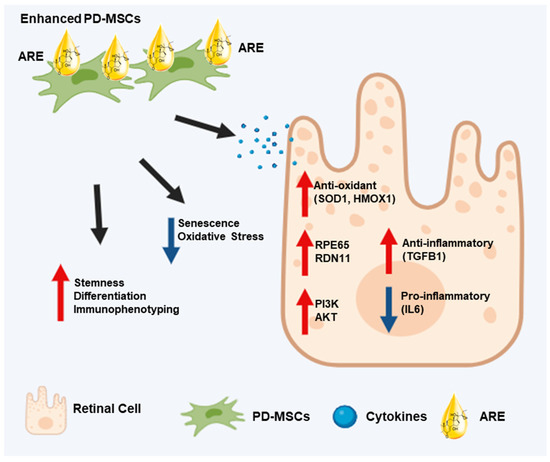 Effects of ARE on therapeutic potential of PD-MSCs on chemically-injured retinal cells. The therapeutic efficacy of ARE-primed PD-MSCs is (1) inhibiting inflammation in injured retinal cells, (2) activating PI3K/AKT signaling, (3) reducing oxidative stress by increasing the expression of antioxidant factors, and (4) promoting the regeneration of injured retinal cells by increasing the expression of regeneration-related factors.