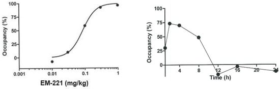 In vivo PDE10A occupancy in the rat striatum after oral administration. Left panel—PDE10A enzyme occupancy at 2 h after different doses of EM-221 p.o. Right panel—PDE10A occupancy as a function of time after an oral dose of 0.1 mg/kg EM-221. Each point is the mean of data collected from 3 rats.
