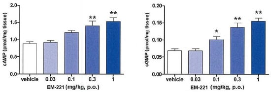 Levels of cAMP and cGMP in striatum (pmol/mg tissue) at 2 h after different oral doses of EM-221. Asterisks represent statistical differences from the vehicle group: * p < 0.05, ** p < 0.01.