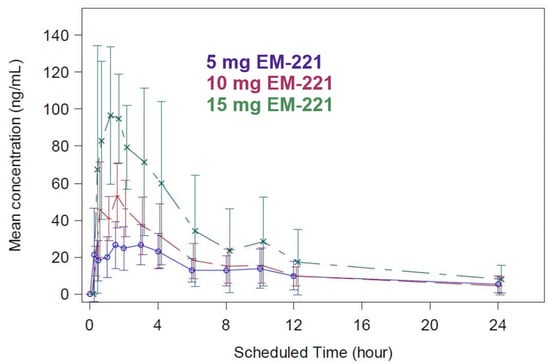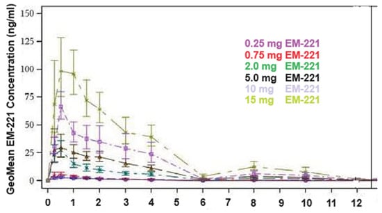 EM-221’s plasma concentration time course after its oral administration at 0.3 mg/kg in rats.