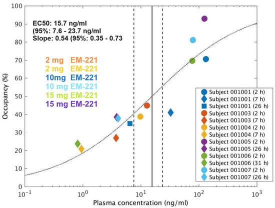 where Cp is the measured plasma concentration of EM-221 (ng/mL), Emax is the maximal apparent achievable change in BPND (%), EC50 is the plasma concentration of EM-221 that corresponds to 50% of that maximal change in BPND (ng/mL), and n is the Hill slope. Variants of the model were considered whereby Emax and n were either fitted or fixed (100% and 1, respectively). Model selection was performed via the consideration of the residual sum of squares and the Akaike Information Criterion (AIC). Where Emax is 100%, the ΔBPND data can be considered as target occupancy; otherwise, the occupancy is given by Occ = ΔBPND/Emax.