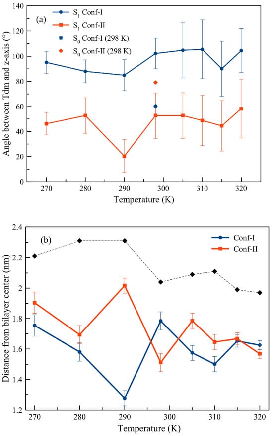 (a) The maximum of the distribution of the angles of the transition state dipole moment (‘tdm’) with respect to the z-axis of the DPPC membrane at different temperatures. The calculations were carried out using the S1 excited state for Conf-I and Conf-II. For 298K, the angle for the ground state of each conformer is given, too; (b) distance (nm) of the head group of Laurdan in the S1 excited state with respect to the center of the DPPC membrane (set at zero) at different temperatures. Black diamonds represent the averaged phosphorous atoms’ distance from the bilayer center, indicating the thickness of the DPPC membrane at different temperatures. The black, blue and red curves are typeset as a guide to the eye for phosphorous atoms, Conf-I and Conf-II, respectively. Error bars were computed considering HWHM of the distribution plots reported in Figures S2 and S8.