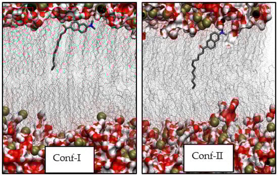 To date, the conformational versatility with respect to the carbonyl group of the Laurdan probe on the GP measurements has not been considered. Through our simulated results in 2019, we were the first to find that this flexibility permits the use of Laurdan as a molecular rotor [], which has since been confirmed experimentally []. As our studies of the probe in Lα and Lβ’ phases proved, the positions and orientations of the two conformers fundamentally differ [,,]. For the conformer whose carbonyl oxygen points toward the β position of the naphthalene core (Conf-I, see Figure 1), an elongated form in its electronical ground state in DPPC (Lβ’) is observed. For the conformer with the carbonyl oxygen towards the α position (Conf-II, Figure 1), an L-shape is seen []. Interestingly, conformational changes are not observed in DPPC, while in DOPC, changes between the two conformations are allowed, due to the increased fluidity of the environment [,].