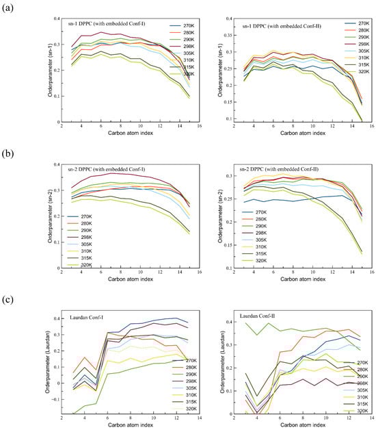 Order parameters for the (a) sn-1 and (b) sn-2 tails of DPPC. The ones for the tail of Laurdan are shown as well in (c). In the left (right) column, the tails are shown for the membrane in which Conf-I (Conf-II) is embedded.