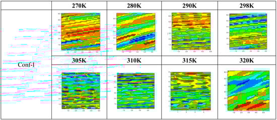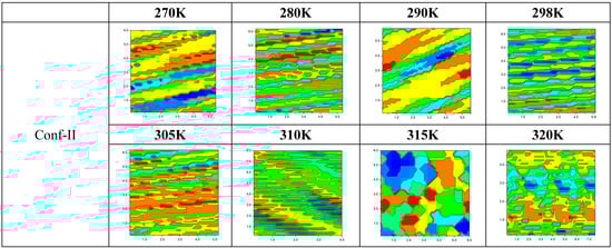 In Figure 5, the last frames of the MD production run at different temperatures are considered, and their thicknesses are compared. For the Lc phases at 270K and 280K, large structures, valleys and peaks are seen at the surface and extend over the whole membrane. For the solid gel phases (290–305K), systematic patches are seen in these structures over the whole surface. The plots at 290K confirm the different interaction of both conformers with the environment; it is clear that Conf-II in a rather broad membrane has the possibility to be only slightly tilted with respect to the z-axis, while Conf-I in a less inflated membrane tends to be more parallel to the surface. For Conf-I, both the amino and carbonyl groups are located deeper in the membrane, while for Conf-II, the amino group interacts with the high-headgroup-density region, and the carbonyl oxygen is found closer to the membrane center.
