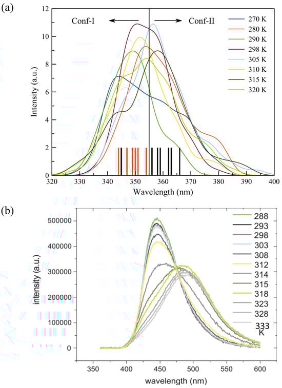 In our theoretical results, lower-intensity shoulders in the 375–400 nm window with a ~15 nm longer wavelength with respect to the maximum of the peak are seen for all temperatures. These results, albeit blue shifted, are in agreement with experimental fluorescence spectra (Figure 6b), in which red-shifted shoulders of ~15–20 nm are reported for the 288–312K (15–39 °C) temperature range. The experimental data show as well that the shoulders disappear at 315K (42 °C), for which a larger, symmetric density profile is indeed found. At the main phase transition between 314K and 315K, the emission changes abruptly: the experimental spectra report a broad and rather asymmetric profile with a maximum at ~450 nm and a longer tail at 314K (41 °C), while at 315K (42 °C), the peak shifts towards 490 nm.