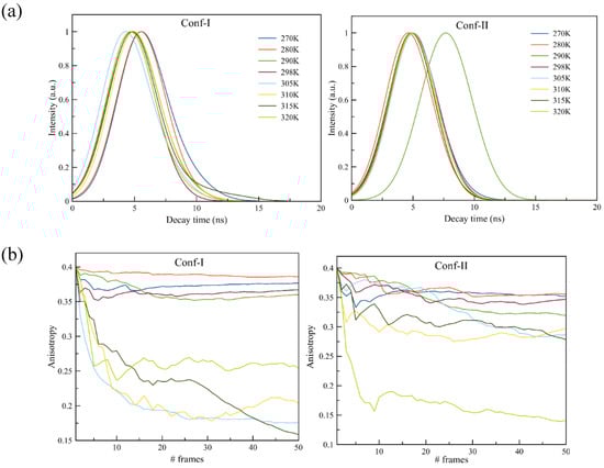 To disentangle the conformational effect from the presence of different phases, we performed additional fluorescence analyses, namely the decay time and the anisotropy decay. From the fluorescence decay time analysis reported in Figure 7, a clear trend is present for Conf-I; increasing the temperature, the decay time decreases towards lower values, going from 6 ns to 4.9 ns. Clearly, for this conformer, the environment has a strong effect on the optical properties, due to its orientation, position and conformation. On the other hand, Conf-II shows little variation while increasing the membrane temperature, with decay time values in the 4.7–5.1 ns range, once more suggesting the weak effect of the surroundings over the fluorescence properties of this conformer. Once more, an outlier is present at 29K, with a very high decay time of 7.7 ns. As mentioned earlier, Conf-II in the DPPC membrane at 290K is oriented almost parallel to the z-axis and located at the interface between the membrane head and water (Figure 2). We remind the reader here that this temperature is at the onset of the solid gel phase.