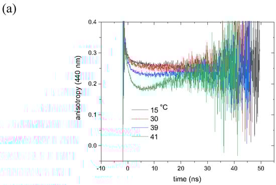 These results were once more validated by experimentally oriented time-dependent anisotropy studies (Figure 8), in which the influence of both conformers can be clearly observed. At 41 °C and in Pβ’, a turn-up in the signal is present, which can only be attributed to the presence of two, or, in principle, more, components. At higher temperatures, the anisotropy generally decays again, while the slope even increases towards 60 °C. The monotonous decaying curves at higher temperatures point at a liquid disordered phase, in which both conformers of Laurdan interchange easily. The slope increases for both channels as the temperature rises, while the time constant of the probe at 440 nm steadily decreases from 3.61 ns at 15 °C in the gel phase to 1.39 ns at 41 °C, and at 490 nm from 2.70 ns in the Pβ’ to 2.41 ns in the Lα phase. In the latter case, at 45 °C and 60 °C, the decay is found to be complete. The decay time constants and the relative abundance for both conformers are further reported in Table S5.