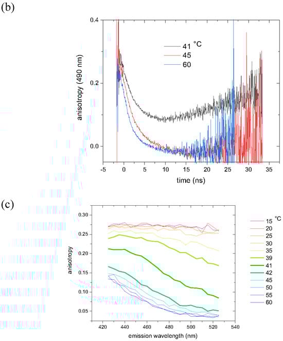 The steady-state anisotropy studies showcase the ripple phase Pβ’, too. In Figure 8, the isolated case for 314K (41 °C) can be clearly distinguished from the closely packed anisotropy lines in the solid gel phase at 290K (15 °C) or at the ones of Laurdan embedded in a liquid disordered phase above 315K (42 °C). The steady-state results confirm once more the possible use of the probe to identify different environments. As we clearly demonstrated throughout the study, this is largely due to the position and orientation of Conf-I, which determine its interaction with its surroundings. As we assign the “odd” behavior of the time-resolved anisotropy at 41 °C/440 nm to two populations with different lifetimes, we fitted the time-resolved fluorescence with two components (see Table 2). For 440 nm, it is visible from the decay lines that this is not a purely mono-exponential decay. On the other hand, 490 nm can only be fitted with a mono-exponential curve. To prove the correctness of these results, we verified that the fitted lifetimes allow for the simulation of the time-resolved anisotropy at 41 °C/440 nm (Figure S20). From these fitting values, it seems that below the phase transition, ~20% of the fast population persists, whereas the fast population dominates the system above the phase transition. This is an additional confirmation of the presence of either conformer of Laurdan in the DPPC membrane at different temperatures.