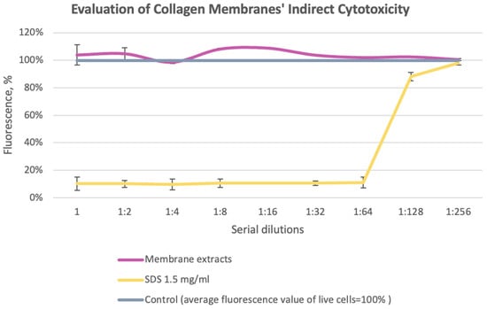 Following the alcohol rinse to confirm the absence of toxicity, an elution test, adapted following the ISO 10993 protocol [19], was conducted. To obtain collagen cube extracts, they were incubated in a cell culture medium at a volume of 1 mL per sample for 24 h at 37 °C. The 3T3 cell culture was passaged, with 5000 cells seeded in each well of a 96-well plate. After 24 h, the cells were treated with extract at a volume of 200 µL per well and left in the incubator at 37 °C for 24 h. The following day, extracts were collected, and alamarBlue reagent (Invitrogen, Waltham, MA, USA) was added according to the manufacturer’s instructions to assess the metabolic activity of the cells. Serial dilutions of sodium dodecyl sulfate (SDS) were used as the positive control. The graph representing the results of the collagen sponges’ indirect cytotoxicity test was plotted using Microsoft Excel 2020 (Microsoft, Redmond, Washington, DC, USA) software. Fluorescence intensity was measured using a Victor Nivo spectrofluorometer (PerkinElmer, Waltham, MA, USA) at an excitation wavelength of 530 nm and an emission wavelength of 590 nm.