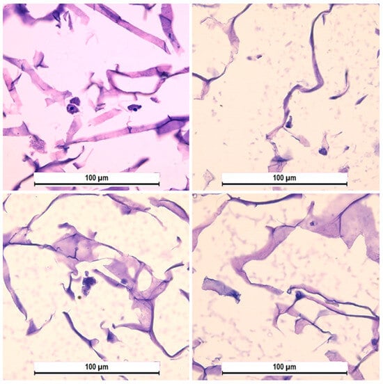During staining cryosections using the nuclear stain DAPI, we succeeded in visualizing cell clusters in different regions of the collagen matrix. However, histological staining did not yield a similar pattern. We attribute this to the fact that hematoxylin and eosin staining is more aggressive. The use of ethanol severely dehydrated cellular structures and delicate collagen fibers, which could have facilitated cell detachment and washout during the staining process [39,40,41]. As a result, we were only able to visualize individual cells in the sections, whereas DAPI staining clearly revealed large cell aggregates (Figure 2 and Figure 3).