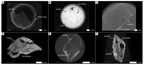 We assume that micro-CT with contrast enhancement using PTA could be applied for the spatial visualization of scaffolds that consist of materials in which PTA could selectively bind with positively charged molecules, such as fibrin, elastin, and silk fibroin [16,35]. However, since one should test the compatibility of PTA staining in an aqueous environment with other scaffold materials, further investigations are required.