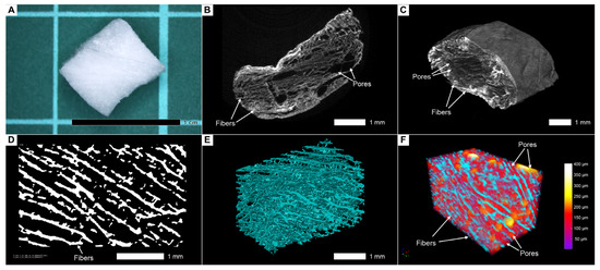 Contrasting with a 3% aqueous PTA solution allows the visualization of collagen sponges under aqueous conditions while maintaining the original configuration of fiber and pore arrangement (Figure 6B,C). A good signal-to-noise ratio made it possible to segment fibers and pores for further analysis, which is important for the quality control of scaffolds and the study of their internal structure (Figure 6D–F).
