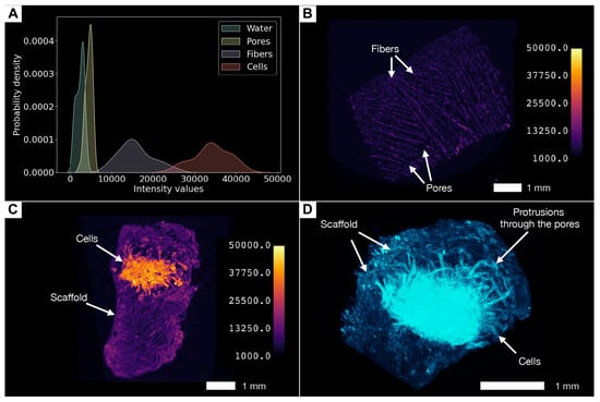 In the samples we studied, we found that cell masses, scaffold fibers, water, and pores have different intensity values (Figure 7A–C). For instance, Figure 7B (unpopulated scaffold, a control sample) and Figure 7C (scaffolds seeded with cells) show images (without any post-processing except basic reconstruction) with color-coding based on intensity values in the identical modes of scanning and reconstruction. It allows the visualization of significant differences in X-ray densities between fibers, water, and pores. The intensity values of pores are slightly higher than those of the water surrounding the sample, and we assume that this is due to the beam-hardening effect that occurs when the X-ray beam passes through the sample (Figure 7A). It is worth mentioning that scaffolds can be labeled for their spatial orientation.