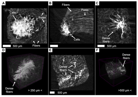 Perhaps the most significant disadvantage is that very dense, interwoven fibers, or clusters of fibers mimicking cell masses due to heterogeneous microparticles of collagen raw material, can form inside collagen scaffolds during production (Figure 9). To alleviate the issue described above, we have identified some criteria that will allow us to distinguish cell clusters from high-density fibers. Firstly, cells grow in free pore spaces within the scaffold, whereas dense fibers generally follow the normal geometry of fibers. During their growth within free pore spaces, cells can acquire peculiar geometries resembling intertwined tubes forming a large conglomerate (Figure 7C,D, Figure 8A and Figure 9A,B). Secondly, during its growth, the colony of cells can deform the surrounding fibers by shifting them with its growing mass, which is expressed in the appearance of deformations along the course of fibers (Figure 9A,B). Thus, although it is not exact, it is possible to identify an area of interest for further analysis. To segment cell masses, it would also be useful to use algorithms that allow the cleaning of the 3D model of unnecessary parts that could be fibers with high density (Figure 8A). An example of such an algorithm is Despeckle in CTAn, which has different modes of sweeping the image [43].