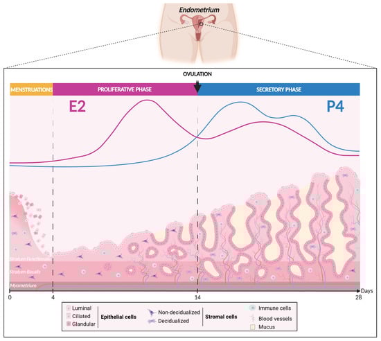 During the proliferative or follicular phase (day 1 to 14), estrogen signaling dominates []. Under the influence of follicle-stimulating hormone (FSH) secreted by the pituitary gland, ovarian follicles develop and secrete estrogens. E2 plasma concentration fluctuates between 31–90 pg/mL and could reach 500 pg/mL just before the ovulatory phase, typically around the 14th day of the menstrual cycle []. The rise in estrogen levels promotes the proliferation of epithelial and stromal cells in the endometrium, contributing to its reconstruction [,]. Notably, the proliferation of the epithelium results from a paracrine signaling initiated by the stromal cells []. Moreover, cilium differentiation is engaged, glands become straight and narrow, and the stroma thickens and vascularizes. This hormonal surge also stimulates the production of cervical mucus, facilitating the transit of spermatozoa [,,].