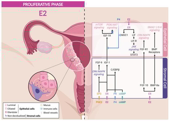 ER Signaling in response to estrogens during proliferative phase. Created with BioRender.com (accessed on 16 June 2024).