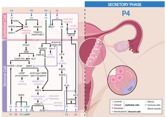 P4/PR signaling inhibits the proliferative effect of E2 observed in epithelial cells and controls the decidualization of stromal cells. In addition, P4/PR signaling drives the differentiation of luminal epithelial cells into ciliated cells and of glandular epithelial cells into secretory cells. Numerous mediators and molecular modulators, essential for decidualization and receptivity, depend on P4/PR signaling and are involved in epithelial–stromal interactions [] (Figure 4).