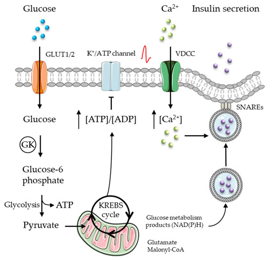 Insulin secretion induced by glucose in the beta-cell. Insulin secretion follows variations in plasma glucose concentrations. Glucose enters the beta-cells through glucose transporters (GLUT1/2). The stimulatory effect of glucose on insulin secretion depends on its metabolism in beta-cells, through glycolysis in the cytosol and KREBS cycle in the mitochondria, and is mediated by triggering and amplifying pathways. The increase in cytosolic ATP concentration ([ATP]) causes the closure of membrane K+/ATP channels, leading to membrane depolarization, and the opening of voltage-dependent calcium channels (VDCCs). The entry of calcium triggers the insulin secretion through a soluble N-ethylmaleimide-sensitive factor attachment protein receptor (SNAREs)-mediated fusion of a readily releasable pool of insulin-containing vesicles within the plasma membrane. This triggering pathway is responsible for the first phase of insulin secretion (or the early peak of insulin, 5–10 min). The second phase, also known as the amplifying pathway, is late, more sustained (30–60 min), relies on K+/ATP channel-independent mechanisms, and involves several metabolites including glucose metabolism products (NAD(P)H), and associated products (Glutamate and Malonyl-CoA).